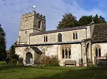 Land at Mildenhall was granted to Glastonbury Abbey in the 8th century, and a church may have been built in the early 9th century.[14][15] The base of the tower of the present church is from the 9th or 10th century, and the rest is the result of stages of rebuilding in the late 12th century and early 13th.[16] In the 15th century the third stage of the tower and the clerestory were added, and most of the windows renewed. The plaster ceiling of the chancel is early 17th century, and the earlier nave roof was embellished at the same time.[3] In the 18th or 19th centuries the south aisle was partly rebuilt and the south porch added. In 1816 a round-headed window was added to the south side of the clerestory, and another over the west door.[17][18]