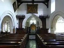 The church is notable for its oak fittings, installed in 1814–1816 and called "outstanding" by Historic England. Julian Orbach, updating Pevsner's work, writes "in Gothick style, the very model of Late Georgian arrangements ... Unusually for rural England everything matches and is to a very high standard".[17] Components include box pews, children's benches, twin pulpits (one a reading desk) with tall backs and decorated testers, and the stone font with wooden cover; and in the chancel, ornate pews, panelling and the reredos with its painted texts. Other work included stone flooring in black and white, and new oak doors.[19] The west gallery, with curved panelled front to accommodate the organ, was completed in 1821.[18] The refitting cost altogether around £2,000 and was instigated by Charles Francis (rector from 1788 until his death in 1821, also rural dean) and paid for by himself and twelve local property-owners, named on six shields displayed in the church.[20]