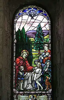 Reconstructed in a style reminiscent of the Arts and Crafts Movement, in the erroneous belief that this was the site of Saint Kentigern's Chapel, the structure incorporates a standing stone in the wall. It was probably a chantry or mortuary aisle of the 15th century.[9] The 14th burial slab of Robert Vesey, and others of a local miller and a knight in armour are preserved in the aisle. The altar stone may be linked to the conversion of Merlin Sylvestris by Saint Kentigern (Mungo).[6]