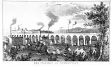Stockport Viaduct was built to carry the Manchester and Birmingham Railway across the valley of the River Mersey at Stockport. The viaduct was designed by the engineer George Watson Buck in consultation with the architect John Lowe.[1] On 31 October 1838, the company's directors met to choose contractors from tenders that had been submitted.[2] The contractors chosen were John Tomkinson and Samuel and John Holme and the work was overseen by the resident engineer W. Adams and subsequently by W.H. Perkins.[1]