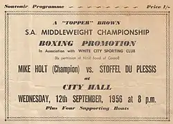 Du Plessis fought Mike Holt for the South African Middleweight title in the Durban City Hall on 12 September 1956.[4]