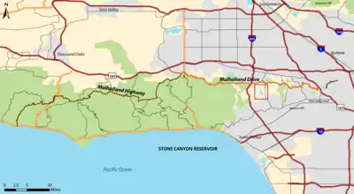 ![]() The Reservoir as seen from the Stone Canyon Overlook off of Mulholland Drive. | |
