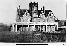In 1853, Marsh soon began construction of a magnificent home built entirely of stone quarried from the nearby hills. The 7,000 square feet (650 m2) Gothic-Revival style home incorporated a 65 feet (20 m) tower and exterior porch supported by octagonal pillars. The entire cost of the home did not exceed $20,000.[1] Abby died in 1855, however, before the Stone House was completed.[2] Marsh ultimately moved into the new house about three weeks before he was murdered.