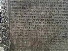 Stone inscriptions in the Kathmandu Valley (Nepal Bhasa:नेपाःमन्दःया ल्वंह पौत) refer to ancient stone slabs, pillars and pedestals with text carved on them. They are the most important sources for the history of Nepal. A vast majority of the inscriptions found in Nepal are from the Kathmandu Valley where they are an ubiquitous element at heritage sites. They consist of royal edicts and dedicatory notes on Hindu and Buddhist temples, stupas, statues, water spouts and other architectural structures.[1] Stone inscriptions are locally referred as Lōhan Pau (Nepal bhasa:𑐮𑑂𑐰𑐴𑑅 𑐥𑑁).