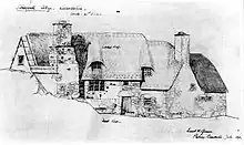 Built between 1897 and 1899 out of the stones found in the immediate locality, and constructed directly onto outcrops of exposed Charnwood bedrock, Stoneywell creates the impression it is an organic part of the landscape.[1] Set away from the road, it is close to Stoneywell Wood and its surrounding gardens are by design and necessity more wild than cultivated. The house is built on a slope and approached from above so that a visitor is required to walk round the house to get to the front door, which faces south-west over the rugged landscape.[2] At one end the roof almost reaches the ground, and the massive chimney stack buttresses the south wall.[2] The roof, like many of Gimson's houses, was originally thatch, but following a fire in 1938 was re-roofed in second-hand Swithland slates.[3] The rooms, windows and roofline step downwards, along the open z-shape of the groundplan, to follow the contours of the hill, such that the ground floor is on three levels, and both groundfloor and dormer windows are all at different heights.[4] The fireplace and doorway have huge Swithland slate lintels, that were found nearby at abandoned slate quarries.[5] The stone walls were built from undressed stones, their surfaces being kept even by the careful selection of each stone by the masons, to fit needs of the wall. Many of the stones were re-used from dry stone walls already on the site, or recovered from the boulder clay and outcrops around about.[6] Externally the stone has been left in a natural state, whereas internally both the walls and the exposed timbers are white. These constructional timbers, matching the intricate irregularities of the ground plan, had been cut and prepared by Richard Harrison at Sapperton, Gloucestershire to Ernest Gimson's design, and transported the 150 miles for assembly on site, showing how much pre-planning and design had gone into Gimson's plan.[7] In 1966 it was listed as a Grade II* listed building.[8]