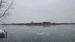 The Great Lakes Institute for Environmental Research described the Stony Island area as "a mix of upland, wetland, and swift-moving, shallow water", and said it was "one of the largest remaining wildlife habitat and fish spawning areas in the lower Detroit River".[4] The "upland" area, consisting of approximately 50 acres (20 ha), contains various old-growth vegetation (including chinkapin oak, hackberry and cottonwood). Its waters are partially shielded by a limestone barrier, creating a shallow "bay" that more than 23 species of waterfowl have been found to use as a staging area during migration.[4] Numerous types of fish spawn at the island; a 1982 report by the U.S. Fish and Wildlife Service listed: