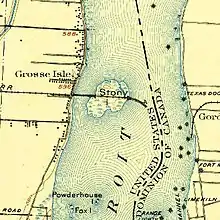 Stony Island's coordinates are 42°07′33″N 83°07′56″W / 42.12583°N 83.13222°W[1] and it is contained within Grosse Ile Township, in Wayne County.[1][4][5] In the Detroit River, it is downstream of Lake St. Clair and upstream of Lake Erie. Immediately to its west is the much-larger Grosse Ile, which is approximately 1,000 ft (300 m) away;[5] it was once connected to Grosse Ile by a railroad bridge,[6] which was demolished by 1912.[7][8] Past Grosse Ile is Trenton, Michigan.[5] To its east is the Livingstone Channel, approximately 500 ft (150 m) wide, across which lies Crystal Island.[5][9][10][11] To the east of Crystal Island, across the Amherstburg Channel, is Amherstburg, Ontario.[10][11] Bois Blanc Island is to the southeast; Powder House Island, Fox Island, Elba Island, and Sugar Island are to the southwest.[9]