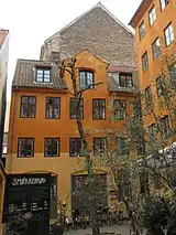 The building consists of three stories over a high cellar and is six bays wide. A gateway on the left side of the building opens to a narrow courtyard lined by a side wing from 1807 to the right and a rear wing from 1807 to the left.
