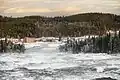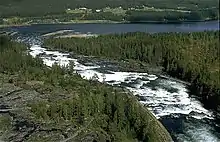 Storforsen is a waterfall on the Pite River in Swedish Norrbottens län is located approximately 38 km northwest of Älvsbyn. With an average flow of 187 m3/s, the rapids are one of the most voluminous in Europe. The rapids stretch over a distance of 5 km in which it drops 82 meters 60 of which are a single waterfall.