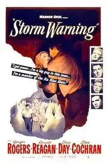 Storm Warning is a 1950[lower-roman 1] American thriller film noir[12] starring Ginger Rogers, Ronald Reagan, Doris Day, and Steve Cochran. Directed by Stuart Heisler, it follows a fashion model (Rogers) traveling to a small Southern town to visit her sister (Day), who witnesses the brutal murder of an investigative journalist by the Ku Klux Klan (KKK). The original screenplay was written by Richard Brooks and Daniel Fuchs.