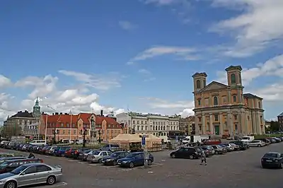 The Church of the Holy Trinity lies southwest of the square. This church was also designed by Nicodemus Tessin the Younger. Its plan is octahedral with a domed roof. It presents a massive portico with four columns. The style, especially the dome, is clearly inspired by the Pantheon in Rome.