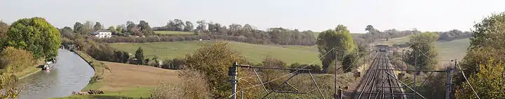 Stowe Hill Tunnel is a railway tunnel on the West Coast Main Line just south of the village of Weedon, Northamptonshire, England. The tunnel runs in a straight line underneath the A5 main road between Weedon and Towcester from about northwest[1] to southeast.[2] The tunnel has a single bore with twin tracks and is 491 yards (449 m) long.[3] The next station southbound is Wolverton and northbound Rugby. The tunnel was opened in 1838 as a part of the London and Birmingham Railway.