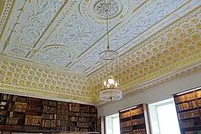 Situated on the ground floor beneath the centre part of the Large Library, this room was created in 1805. It was the last major interior to be added to the house and was designed by Sir John Soane. The plaster ceiling pattern is based on a very shallow fan vault. The plasterer was one William Rothwell, who charged £495 10 shillings & 7 pence. The centre of the ceiling contains a circular panel 4 feet 6 inches (1.37 m) in diameter that contains 726 painted armorial bearings of the various families that the then Marquess was descended. the wooden bookshelves include glazed bronze doors based on the bronze screen around Henry VII's tomb in Westminster Abbey. The fireplace was supplied by a brass-founder Thomas Catherwood in 1807 for £100. This room used to contain amongst other treasures 1085 Saxon & Irish manuscripts, the Saxon Manuscripts were inherited from Thomas Astle under the terms of his will in 1803 on payment of £500, the Irish manuscripts were purchased from Charles O'Conor in 1804. These are now either in the British Library or Royal Irish Academy including the Stowe Missal. The manuscripts now in the British Library include The Medieval Bestiary, Stowe MS 1067 and the Psalter, Stowe 2 (Psalter). The room was furnished with ebonized mahogany tables and chairs inlaid with ivory, one of the tables is now in the collection of the Victoria and Albert Museum. The door from the library has on the outside a carved stone relief dated to the late 16th century, above it, of The Battle of Bosworth Field, the Gothic Staircase by the door connects the two libraries.[25]