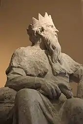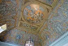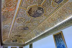 located behind the north portico this is the main Entrance Hall of the house and the least changed of the rooms dating from the 1730s. The ceiling has a deep cove, and was painted by William Kent in grisaille on a gold background imitating mosaic. There are six classical deities depicted in the cove, Mercury, Jupiter, Venus, Saturn, Apollo and Diana. There are also nine of the signs of the zodiac. The flat centre of the ceiling is enclosed in a plaster beam, which in turn encloses a square with a circle within which encloses a painting of Mars. The south wall has in its centre a large set of doors which lead into The Marble Saloon, either side of these doors are portraits by Sir William Beechey of on left Richard, first Duke of Buckingham & Chandos on the right Anna Eliza, First Duchess of Buckingham & Chandos she is depicted with her son later the 2nd Duke. The west wall has above the fireplace Thomas Banks's white marble relief of Caractacus before the Emperor Claudius in its centre which is flanked by two doors. The east wall has above a small staircase leading to the ground floor, Christophe Veyrier's white marble relief of The family of Darius before Alexander the Great in its centre flanked by two doors. Works of art sold in 1848 that used to be in this room include Anthony van Dyck's portrait of the Marquess of Vienville, and among other sculpture two marble vases bought as Ancient Roman but actually the work of Giovanni Battista Piranesi, one of these is now in the Los Angeles County Museum of Art.[13]