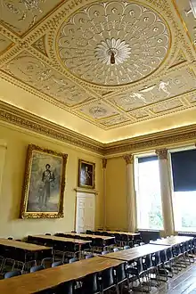 Located immediately behind the Eastern Pavilion, the Chapel was created in 1742–1748 and originally rose through two floors. The room was divided into two floors in 1929 when the new school chapel was built, all the timber panelling being reused in the new chapel. Only the plaster ceiling decoration survives, this consists of octagons, crosses and hexagons. The elaborate carved wood panelling of cedarwood came from a house in Cornwall also called Stowe. It had been carved by Michael Chuke, a pupil of Grinling Gibbons. The most elaborate pieces of carving were the gallery on the south side, the octagonal pulpit dated 1707 and the elaborate reredos that reached nearly the full height of the room, the lower half having two Corinthian columns flanking the altar above which used to hang a copy of Rubens's painting of 'Holy Lamb'. This in turn was flanked by rich carving of fruit and plants. Above was a very rich carving of the Royal Arms.[24]
