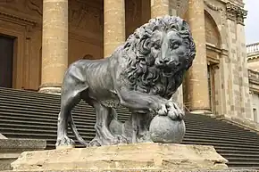 There is a flight of thirty-three steps the full width of the portico which descends to the South Lawn. The staircase has solid parapets either side that end in sculptures of Medici lions standing and resting a paw on a ball. These are the original lions dating from the late 1700s. They were sold in 1921 to Blackpool Corporation and had been standing in Stanley Park in Blackpool but were reinstated in 2013 in a swap deal that saw copies going to Blackpool. Either side of the portico are two tripartite windows separated and flanked by Ionic columns. These are enclosed with an arch that contains a carved Portland stone tondo in the tympanum with carvings of The four seasons, and is in turn flanked by twin Corinthian pilasters the same size as the columns of the portico. The facade is surmounted by a balustraded parapet, in the centre of the parapet of the east pavilion is a sculpture of two reclining figures of Ceres and Flora the corresponding figures on the west pavilion are of Liberty and Religion. The end pavilions each have three tripartite windows matching those on the central block, the tondos of which are each carved with a sacrificial scene.