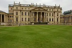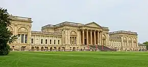 The house is the result of four main periods of development.[8] Between 1677 and 1683, the architect William Cleare was commissioned by Sir Richard Temple to build the central block of the house.[9] This building was four floors high, including the basement and attics and thirteen bays in length. Cleare had worked as Christopher Wren's chief joiner and based the design of the house on that of Coleshill.[10]