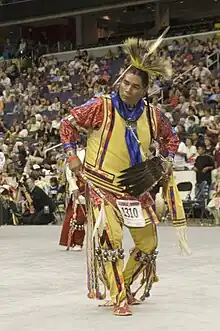 The Straight Dance is considered to be more dignified or formal than other pow wow dances.[3][4] The general steps for the dance involve a "toe-heel" step where the dancer taps the ground with his toe on the first drum beat and then places his whole foot down on the second beat. The dance resembles a hunting or warring party and therefore the dancer must not dance backwards as that would symbolize a retreat from the enemy.[5] Instead they always dance clockwise around the circle. As a Southern dance, it is danced to a Southern Drum.[6]