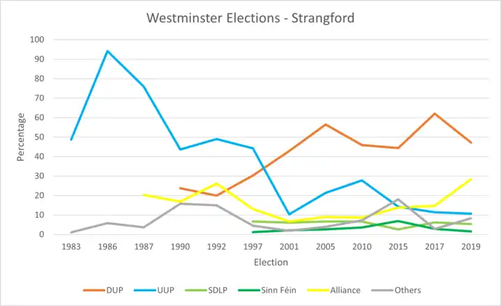 The constituency has been represented by Unionist candidates since it was formed. There have not been significant votes for parties outside the traditional unionist block, although the Alliance has saved its deposit in every election.