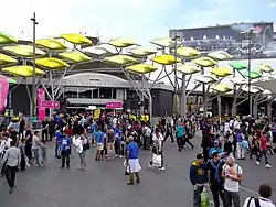Stratford Centre is a shopping mall and indoor market in Stratford town centre in east London. It is situated east of the busy Stratford Regional station, separated only by the Stratford bus station, collectively contributing to the high footfall through Stratford Centre, which stood at 21 million visitors in a 2010 report,[1] as many people use it as a cut-through between the stations and Stratford Broadway. Stratford Centre is adjacent to the Westfield Stratford City shopping complex and the sports facilities of Queen Elizabeth Olympic Park, further contributing to Stratford town centre being east London's primary retail, cultural and leisure centre.