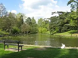 The traditional park includes a Victorian bandstand which hosts band concerts during the summer, and there is plenty of space for dog walking and other leisure activities. There is a lake which is often used for angling competitions. It contains many fish and ducks and swans. There is a 6-inch (150 mm) scale model railway track skirting the lake.