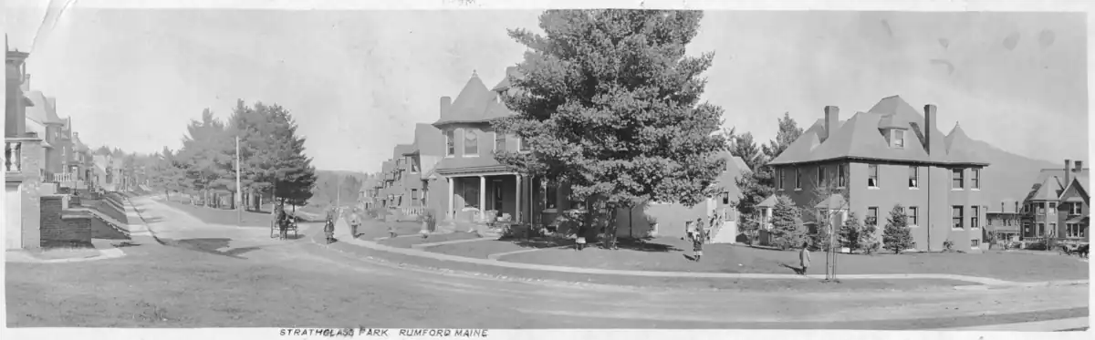 Hugh J. Chisholm began developing his paper works at Rumford in the 1880s. Having seen the condition and poor quality of worker housing in large industrial cities, he decided to attract workers by providing higher-quality accommodations, hiring New York City architect Cass Gilbert to design the buildings. Chisholm named his development "Strathglass", after the Strathglass River in Scotland, which ran near his family's ancestral seat. The street names in the district are also Scottish in origin.[2]