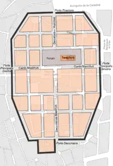 The center of the city was the forum, the central square dedicated to public life and business. From here, there were two main roads: the cardo maximus, oriented north-south (today's Libretería and Call streets) and the decumanus maximus, oriented east-west (Obispo, Ciudad and Regomir streets), approximately in the center of the walled enclosure.[32]