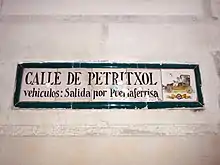 Some streets also used to be named for the presence of singular buildings (Palace, Cathedral) or various establishments (Hospital, New Baths). Tradition has it that the name Carassa Street comes from a carota on the corner between this street and Mirallers Street, which announced a nearby brothel.[39]