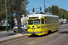 Cincinnati has been criticized for closing the streetcars and inclines without realizing their potential for tourism dollars.[12] In 1947, San Francisco's cable car system was threatened with closure for similar reasons.[13] A plan was put in place that would have replaced the city's cable cars with a new "super bus" system,[13] but a public vote saved the cable cars.[12] Today San Francisco's cable cars are vital to the city's tourism industry,[13] carry 7.5 million passengers a year, and generate more than $20 million in fare revenue.[14] A popular PCC streetcar on San Francisco's F Market & Wharves line is painted bright yellow with green stripes, in honor of the Cincinnati Street Railway.[15][16]