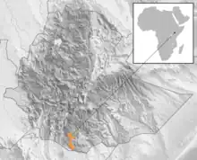This species is endemic to central-southern Ethiopia.[10] It lives in a small area circumscribed by the towns of Yabelo, Borena, Mega, and Arero in Sidamo Province, and settles in wildlife under protection within Yabelo Wildlife Sanctuary and Borana National Park.[6] Its total range covers about 2,400 square kilometers (930 sq mi).[6]