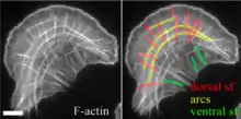 An essential feature of many cells is their ability to migrate towards certain mechanical (Durotaxis) or chemical (Chemotaxis) stimuli.[24] Cell migration takes place through the concerted action of three Rho family GTPases: Rho, Rac, and Cdc42. When GTP-bound, Rac will cause the formation of lamellipodia, and Cdc42 will cause the formation of filopodia, thus promoting cell migration. In the migrating cell, there are three main types of stress fibers: ventral stress fibers, transverse arcs, and dorsal stress fibers.[25] Ventral stress fibers are associated with focal adhesions at both ends, are located on the ventral surface of the cell, and function in adhesion and contraction.[26] Transverse arcs are not directly linked to focal adhesions, and typically flow from the leading edge of the cell, back towards the cell centre.[27] Dorsal stress fibers are located at the leading edge of the cell. They attach to focal adhesions on the ventral surface of the leading edge, and extend dorsally, towards the cell centre to attach to transverse arcs.[28] During cell migration, actin filaments within stress fibers will be recycled by a process of retrograde actin flow. The mechanism of dissolution of the focal adhesion itself is poorly understood.