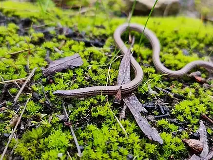 The striated worm-lizard (Aprasia striolata) is a species of legless lizard in the family Pygopodidae. It is endemic to southern Australia (southern Western Australia, South Australia, and western Victoria).[1][2] Commonly known as Striated worm-lizard but has also been referred to as the Striped or Lined worm-lizard[3] due to its pattern of long, thin parallel streaks. Some populations such as those in WA and Kangaroo Island may have absent stripes or the lines present as lines of dots.[4]