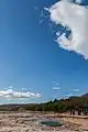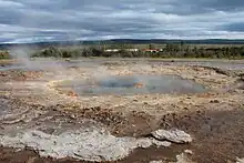 Strokkur belongs to the Haukadalur valley area, where various other geothermal feature such as mud pools, fumaroles and other geysers are located around it, such as the famous Geysir geyser, which lies only 50 metres (160 ft) to the north.[3]