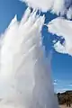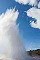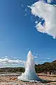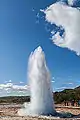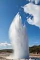 Strokkur (Icelandic [ˈstrɔhkʏr̥], "churn") is a fountain-type geyser located in a geothermal area beside the Hvítá River in Iceland in the southwest part of the country, east of Reykjavík.[1] It typically erupts every 6–10 minutes.[2] Its usual height is 15–20 metres (49–66 ft), although it can sometimes erupt up to 40 metres (130 ft) high.