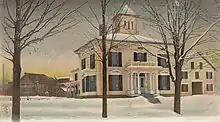 The narrow gauge Sandy River Railroad connected Farmington and Phillips in 1879. By 1886, town industries included a boot and shoe factory, machine shops, Maine's first cheese factory,[6] a clothespin manufacturer, a maker of cane seat chair bottoms, and an excelsior factory. It was noted as "one of the prettiest villages in the county."[7]