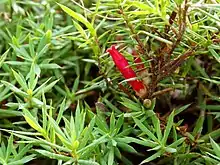 Styphelia humifusa grows as a spreading mat-like shrub up to 50 cm (20 in) high and 0.5 to 1.5 m (20 in to 5 ft) across.[2] Its hairy stems bear blue-green pine-like acute leaves 0.5-1.2 cm (0.2-0.5 in) long. The tubular flowers are up to 2 cm (0.8 in) long and appear from February to June, and are all red, unlike the red and green flowers of A. pinifolium. Flowers are followed by green globular berries around 0.4-0.6 cm (0.2 in) in diameter, which become reddish as they ripen.[3]
