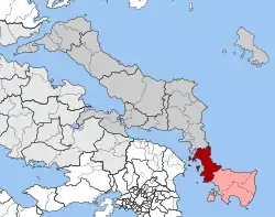Styra or "Chorio" (Greek: Στύρα , Χωριό ) is a village and a former municipality on the island Euboea, Greece. Since the 2011 local government reform it is part of the municipality Karystos, of which it is a municipal unit.[2] The municipal unit has an area of 188.583 km2.[3] It is located in the southern part of Euboea, facing the eastern shore of Attica across the South Euboean Gulf. Nowadays it can be reached by ferryboat from the tiny harbor of Agia Marina, as well as by bridge from Chalcis. Above the port there is a hill where the church of Saints Kostantine and Helen is situated with a panoramic view of the coast and Stouronisi (Styra Island). Styra is a very popular destination for Athenians during the summer period. After the collapse of the Iron Curtain, Albanians migrated into the area. The town takes its name from the ancient town of Styra.