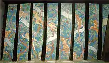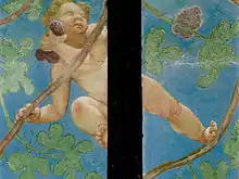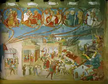 Lotto also frescoed the ceiling between (and using) the beams, creating a fake pergola against a bright blue background, with playing putti and cartouches with biblical and liturgical passages about vines and wine as used in the mass.[3] The brushwork is quick but efficient and the work's taste for popular narration (typical of Lotto) remains wedded to the north Italian tradition.