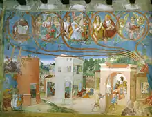Either side of the figure of Christ are a series of buildings and landscapes, all showing scenes from the life of Saint Barbara, her conversion and her martyrdom under Maximian and Diocletian. They are set in city scenes such as a marketplace, giving a popular and lively feel to the storytelling.[7] The figures are smaller than the saints in the upper register and show the saint's life as an unheroic one, a series of anecdotes, similar to works from northern Europe at that time, anti-rhetorical and anti-classical, as do the unusual colours chosen, from yellow with violet, pink with green and white with brown. This conception of scenes within an architectural setting owed much to the example of the Sacro Monte di Varallo.[5]