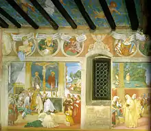 Simple and rustic in its architecture, the chapel's plan is essentially rectangular with a pitched wooden roof supported by exposed beams, along with a small semicircular apse with some modest existing frescoes from before Lotto's time.[3] Lotto's frescoes are spread over three walls above a large plinth. Together they form a complex iconographic programme on redemption and faith as incarnated in the lives of saints Barbara (north side), Brigid (south side), Mary Magdalene and Catherine of Alexandria (back wall), along with Christ's victory over evil as predicted by the prophets and sibyls and guaranteed and confirmed in the lives of the saints.[5] Several figures show peasants and other working class figures, often studied from life and previously unrepresented in Italian painting.[6]