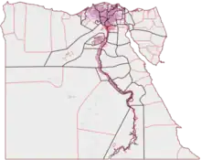Egypt is divided into 27 governorates (muhāfazāt) and each has a capital and at least one city.[19] Each governorate is administered by a governor, who is appointed by the President of Egypt and serves at the president's discretion. Most governorates have a population density of more than one thousand per km2, while the three largest have a population density of less than two per km2.[20] The governorates of Egypt are: