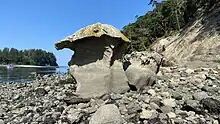 In 2012, paleontologists Christian Sidor and Brandon Peecock discovered a fossilized femur bone from a theropod dinosaur on the island's shore. This was the first dinosaur fossil discovered in Washington state. Given the lack of other fossils from the dinosaur, it's unclear exactly which species of theropod the bone came from.[4][5]