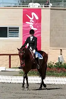 In 2018, she was competing in dressage competitions by using six to eight "living markers" friends and volunteers who call out letters of the alphabet, directing her around the course. In 2018, she was being sponsored by businessman Terry Snow.[2]