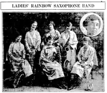 She toured with various women's orchestras in her career. During World War I she organized the Ladies' Rainbow Saxophone Band (later the Ladies Rainbow Sextet), to entertain troops in camps.[2] The players wore rainbow-themed stage costumes and the lighting carried the theme as well. They toured American cities, college campuses and other gatherings through the 1920s, bringing "a happy, lively mixture of good music", by one newspaper account.[1][3][4][5] The Ladies' Rainbow Saxophone Band entertained President Warren G. Harding during his time in the White House.[6]