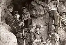 Kids exploring the Jesse James Cave, high on the bluffs overlooking the Missouri River near Sugar Creek, Missouri in 1950.