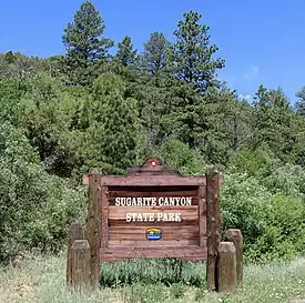 Sugarite Canyon State Park is a state park of New Mexico, United States, featuring a historic early-20th century coal-mining camp and natural scenery at the border of the Rocky Mountains and the Great Plains. The park is located on the Colorado–New Mexico state line 6 miles (9.7 km) northeast of Raton, New Mexico.