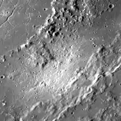 Suge Facula lies between the inner peak ring and rim in the southeast portion of Rachmaninoff crater, in the Hokusai quadrangle of Mercury.
