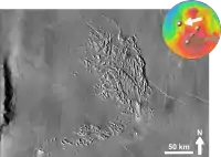 Sulci Gordii in the feature in the Tharsis quadrangle of Mars. The term "sulci" is applied to subparallel furrows and ridges.[1] It is located at 18.9° north latitude and 125.5° west longitude. It is 400 km long and was named after a classical albedo feature name.[2]