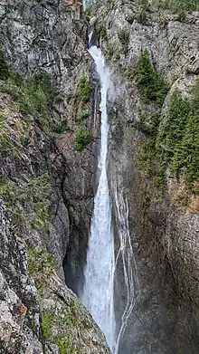 Sulphide Creek Falls is a tall, moderately large volume waterfall within North Cascades National Park in Washington state that is one of the tallest waterfalls in North America.[2] The falls drop from Sulphide Lake (elevation 3,800 ft (1,200 m)) on the southeast side of Mount Shuksan down a narrow flume-like canyon to a broad basin below. Because of the narrow, twisting shape of the canyon the waterfall is exceptionally difficult to see from ground-level perspectives. The total vertical drop of the waterfall is in the range of 2,100 feet (640 m) to 2,200 feet (670 m) feet, but it has not yet been accurately measured. Foot access to the bottom of the waterfall involves 2.5 miles (4.0 km) of off-trail travel in extremely brushy terrain and several potentially dangerous fords of a large stream.[1]