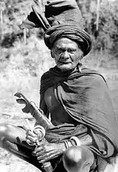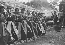 In the past, the main clothing was ornamented sarong ikat,[14][15] where both men and women covered them only at the lower part of the body. The most important part of the traditional attire of Sumba is located on the body cover in the form of large sheets of hinggi fabric for men and lau fabric for women. From the hinggi and lau fabrics which is made by weaving techniques and its application of muti and hada are revealed as various symbols in the social and economic context.[16]